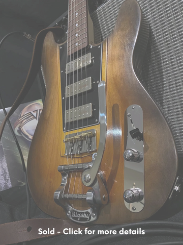 “The Kingwood” 308-3 Bigsby has all the feel, class and beauty of a great vintage instrument with its Vintage Burst and Bigsby B5 Vibrato. But at its heart is a rebellious, hard-rocking soul that has all the dirt and growl you could ever want. It has been crafted from a select 2 piece Alder body and features 3 Kinman Little Ripper pickups as well as a Rock Maple neck with Rosewood Fingerboard, 9.5” Radius, 21 Frets with a classic 60s C shape profile.